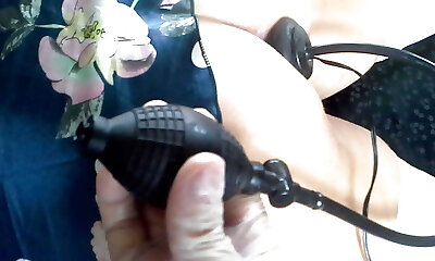Foray of the cock with dilator and finger. Cumshot on the tits.